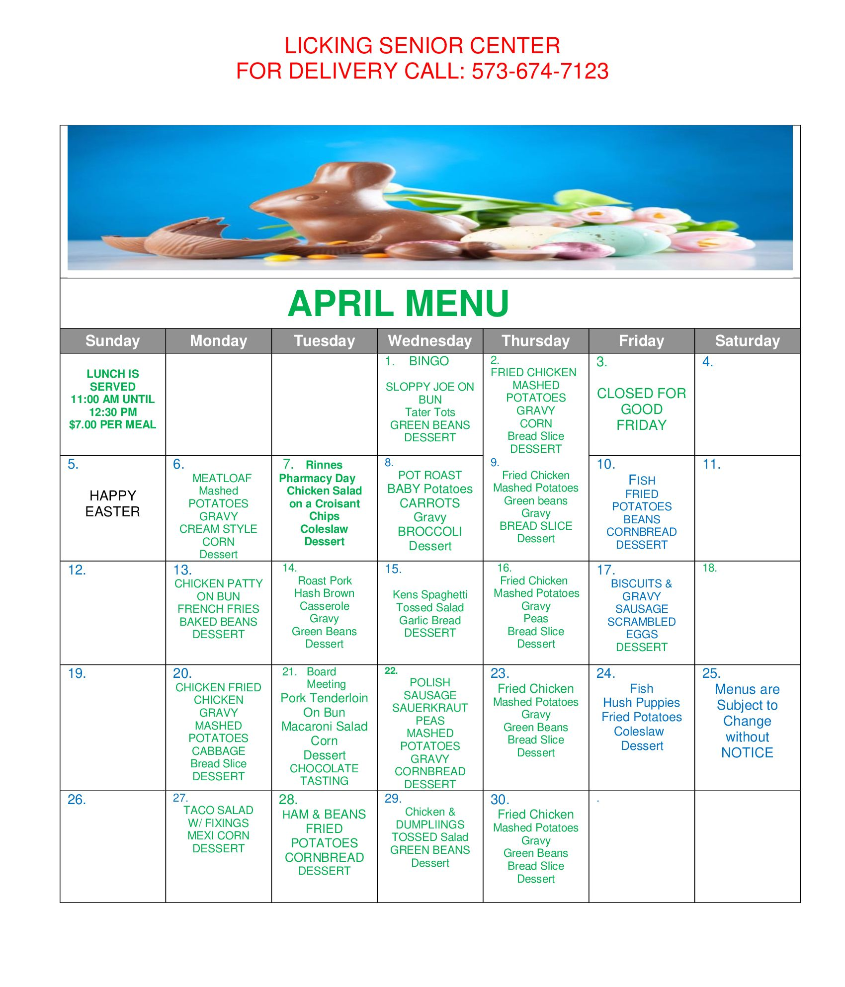 Our Meals are served Monday- Friday from 11:00 am until 12:30 pm. All meals are $7.00 each.